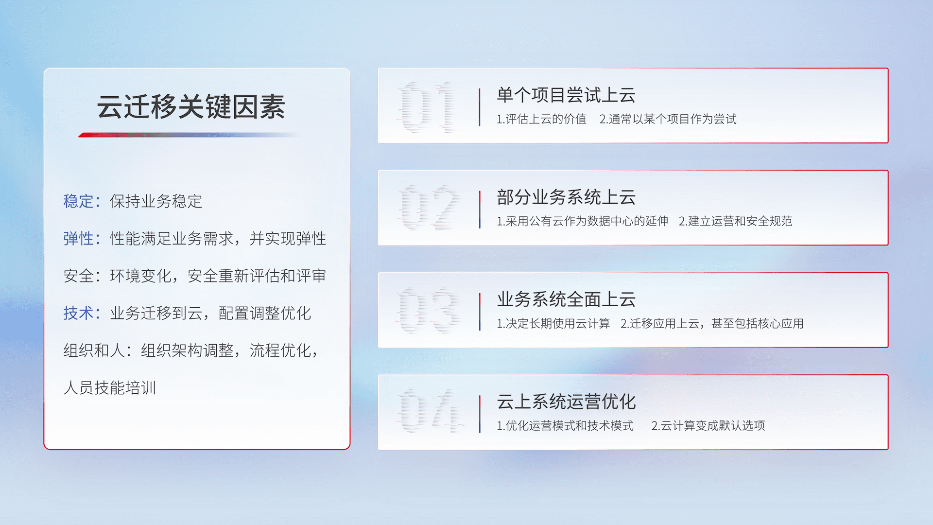 结合实际业务,,,,从规划设计、、、、云平台选型、、云原生改造、、、数据迁移、、集成交付,,,迁移全过程为客户识别最佳上云路径,,,,做好风险识别管理,,,,设计网络架构、、、、身份权限、、安全审计合规、、操作审计、、、日志审计、、监控告警策略、、多站点容灾设计等,,,对云上基础设施进行整体规划,,提升IT治理水平,,,以满足弹性、、、高可用、、、高性能的需求。。。